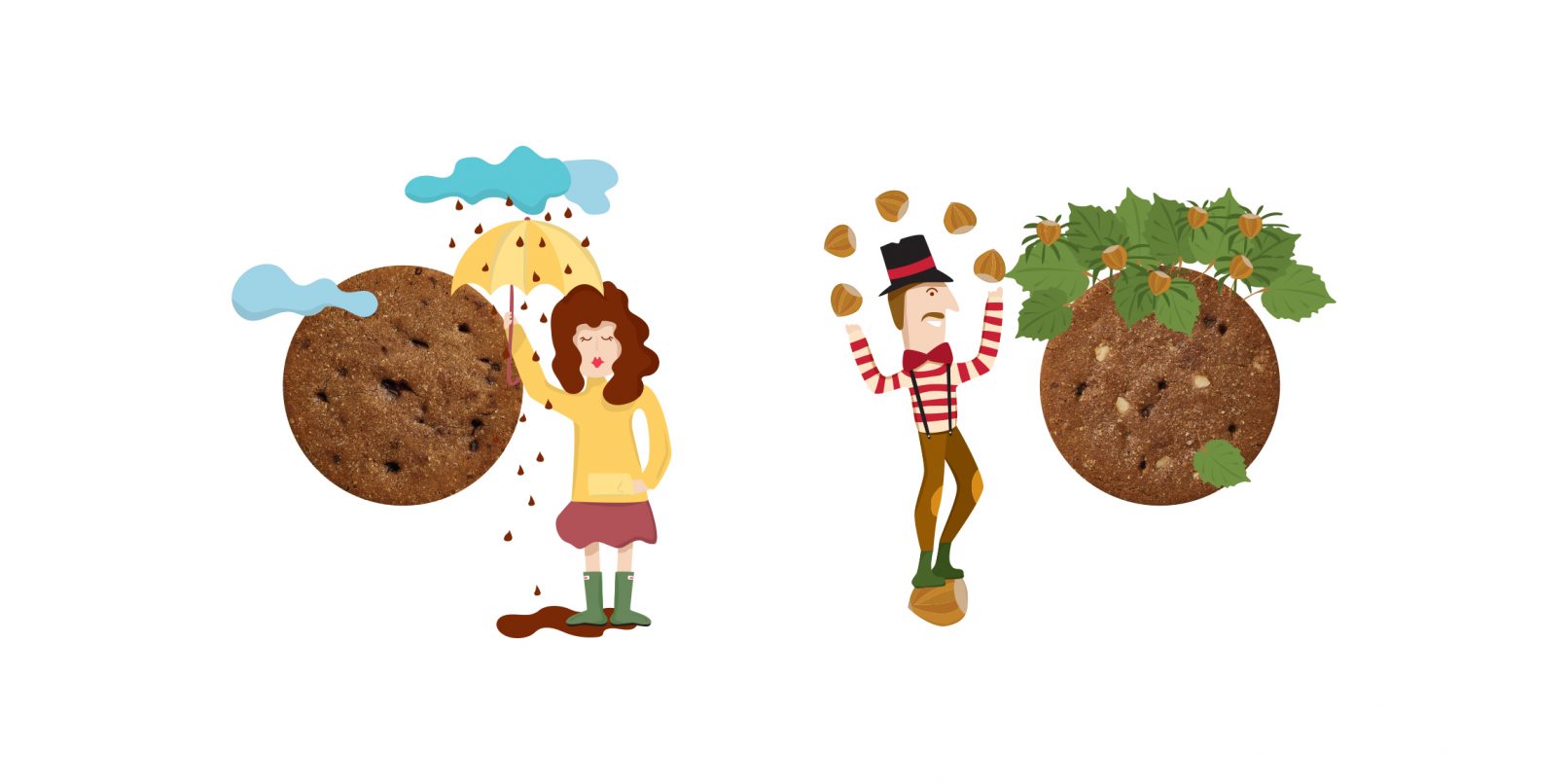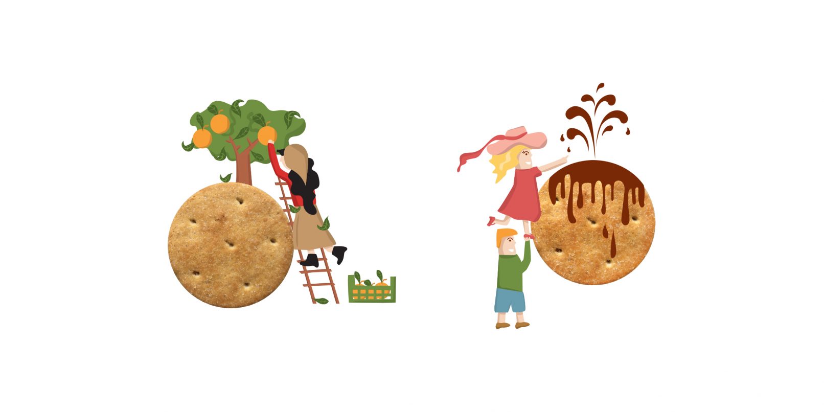 For each of the cookie flavours we created mini stories that are very appealing to children, who are the core target audience, and in which the protagonists interact with the key ingredients in a playful way; we also adopted an illustration style reminiscent of a children’s picture book.