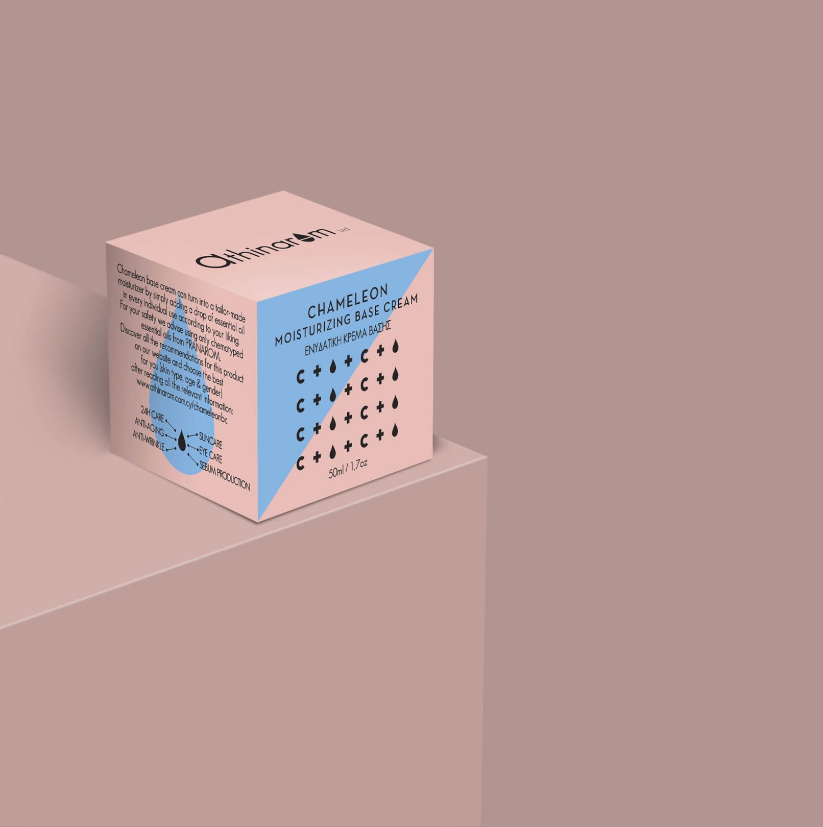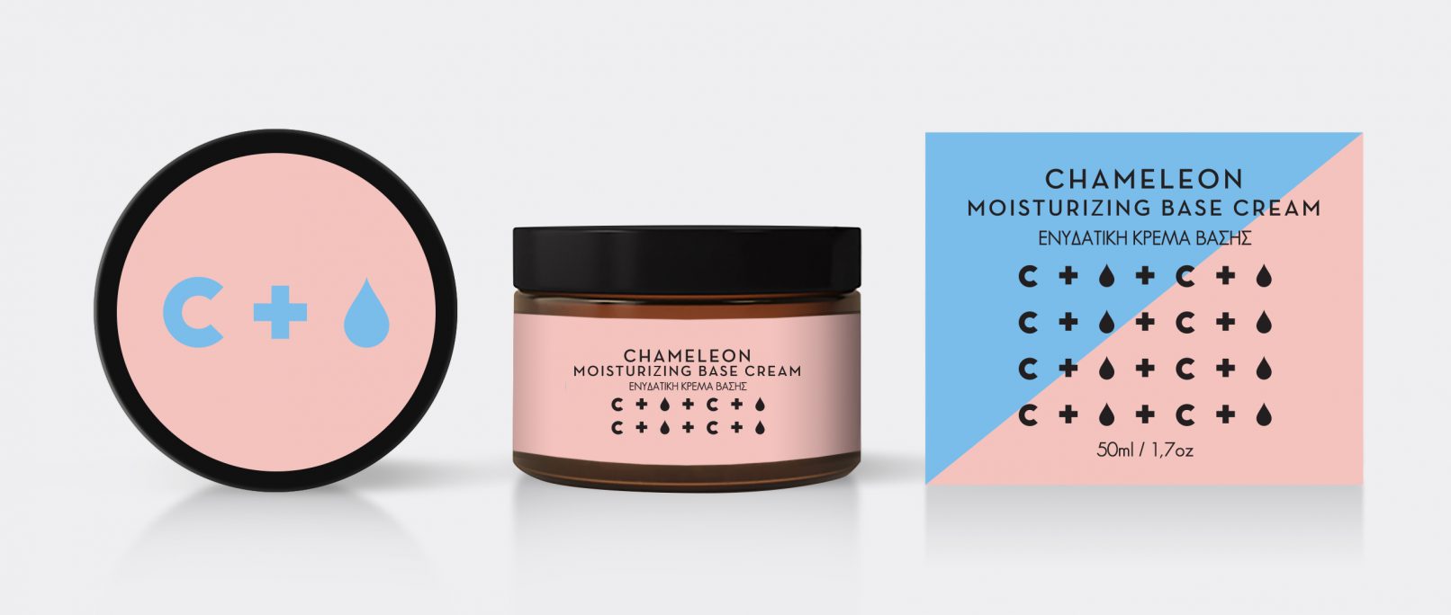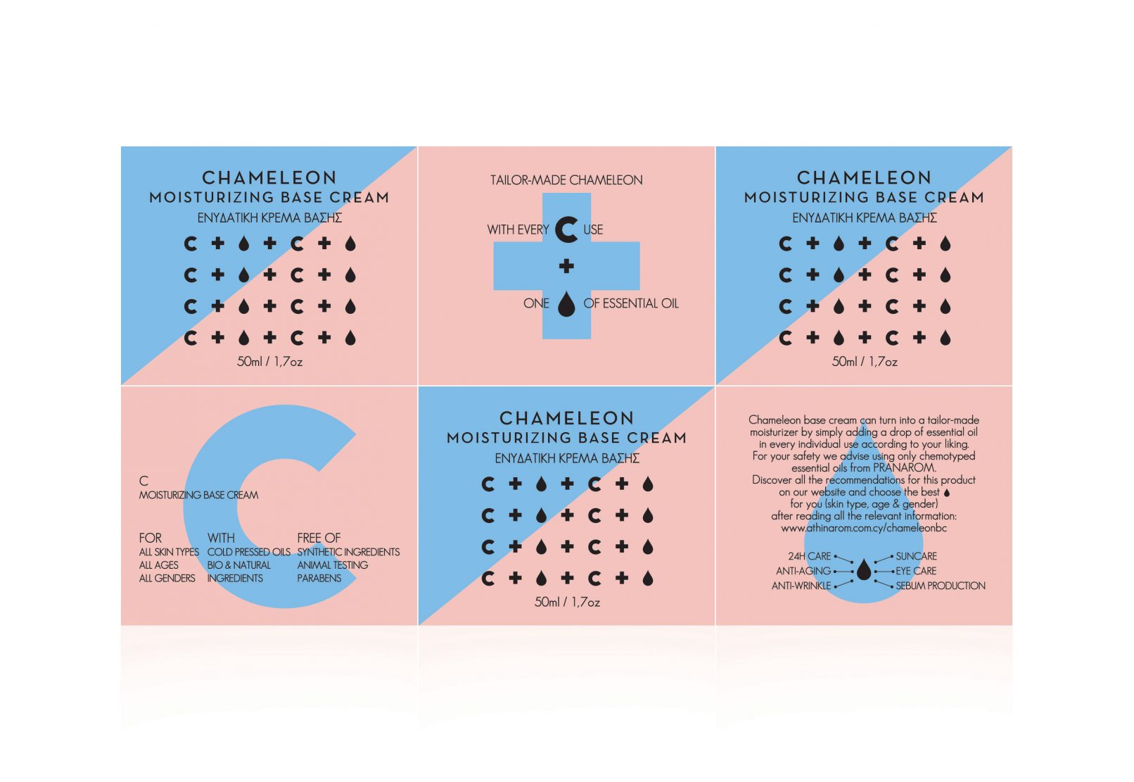 We wanted to clearly communicate on the packaging that this is a base cream to which different essential oils can be added, so we have illustrated the process of adding an essential oil – symbolised by a drop – to the Chameleon base cream – symbolised by the initial letter ‘C’ – respectively.