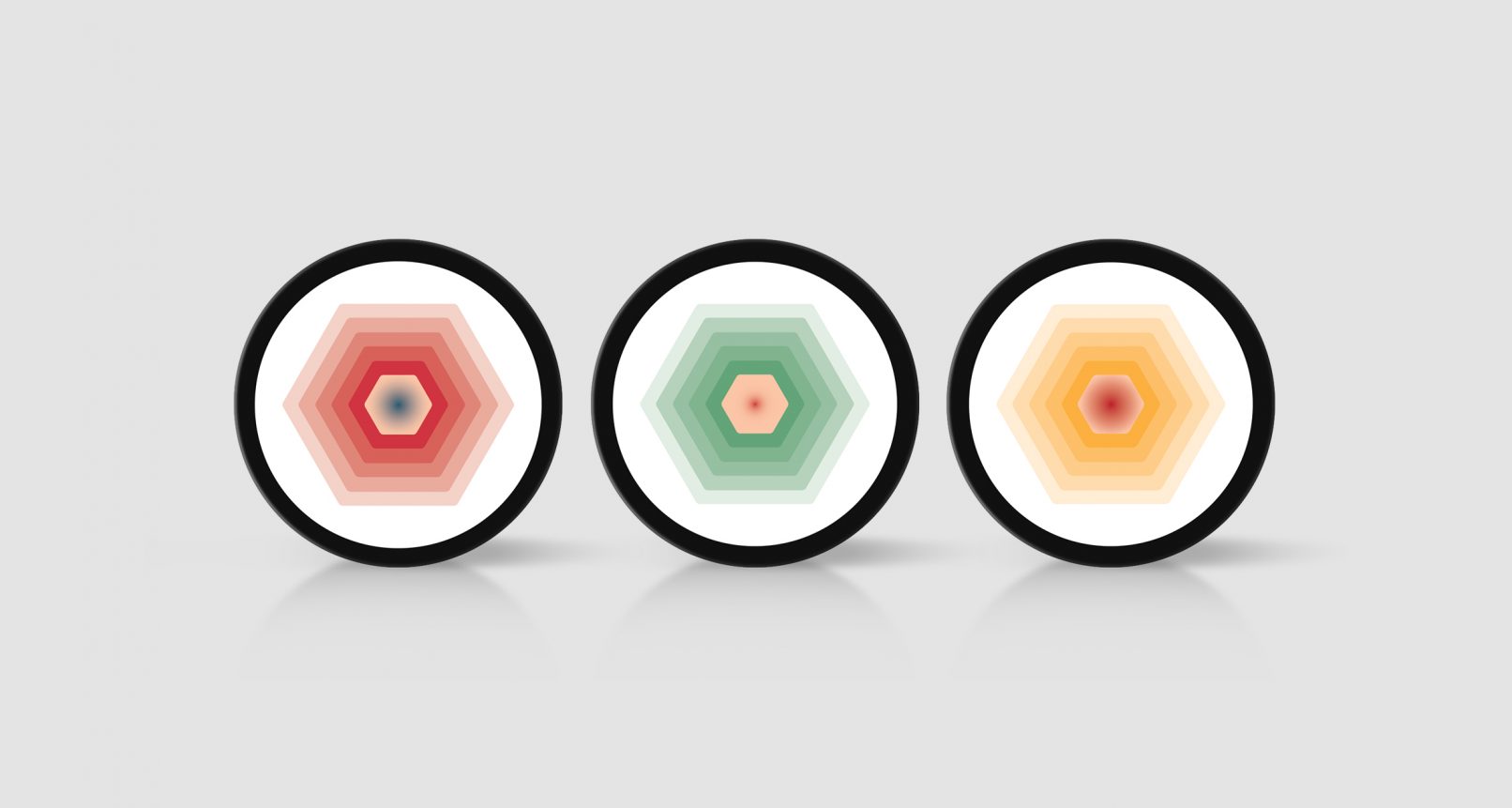 Initially, we symbolized the problem with a circle and a color that simulates the way it manifests on the skin, placing it in the center of the hexagonal cell.
