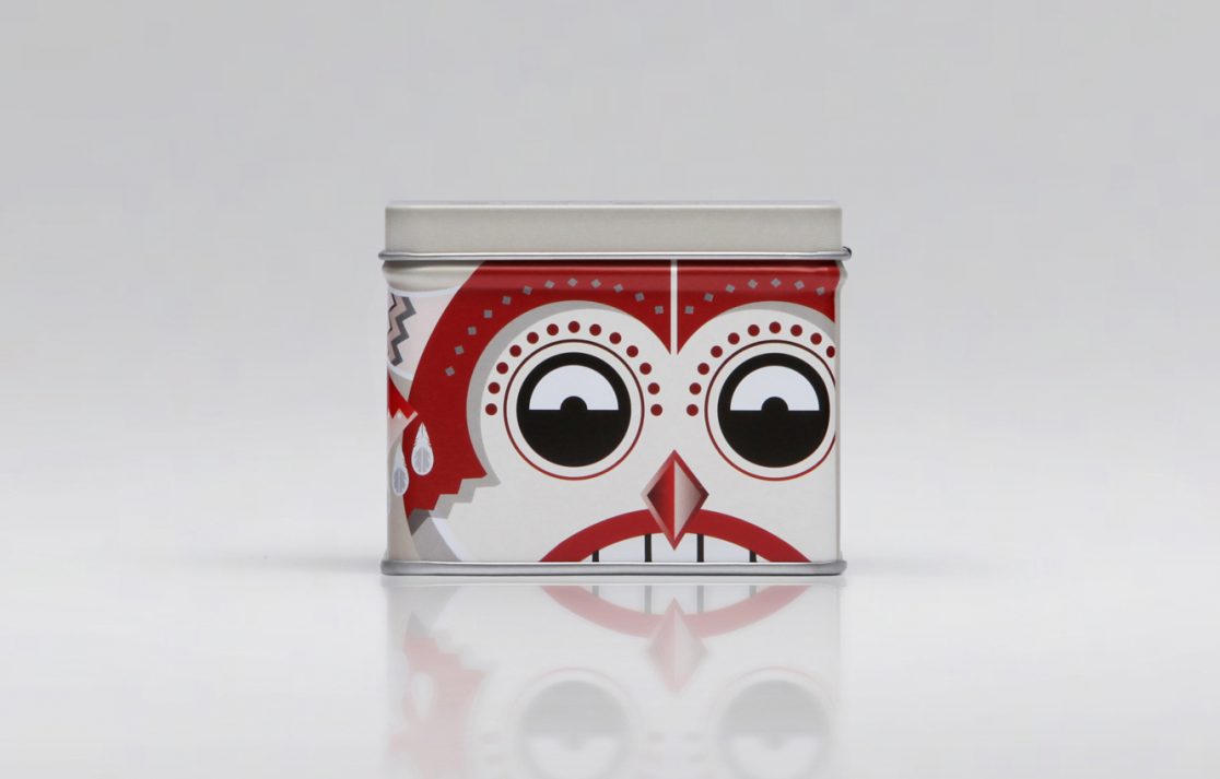 The entire mask appears on the top lid of the tin, accompanied by a word mark that matches the overall tribal aesthetics of the packaging, and then repeats and wraps around the sides of the tin in an oversized proportion. This change in scale aptly highlights the smaller details of the illustration.